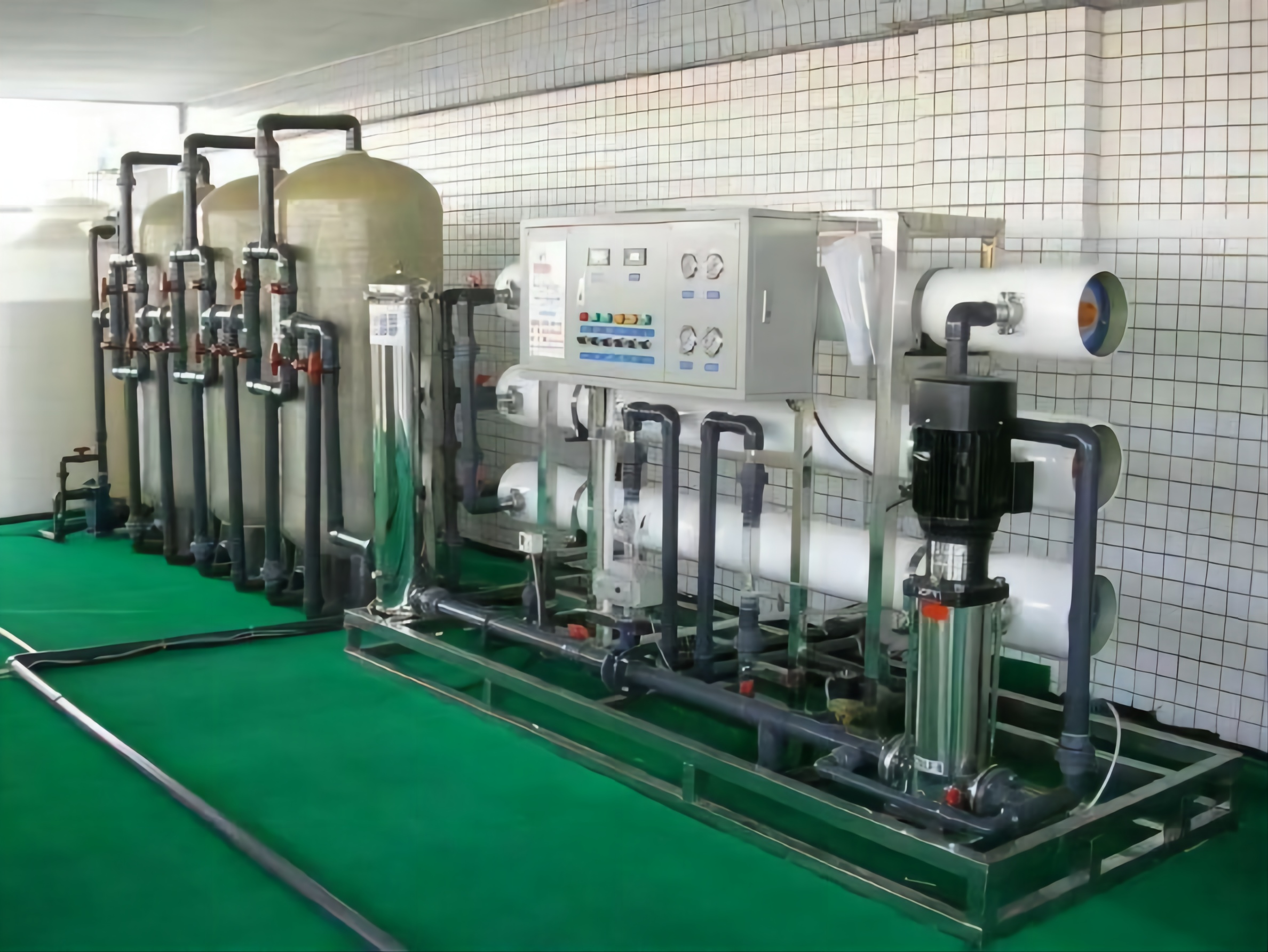 ①原水→原水泵→多介質(zhì)過濾器→活性炭過濾器→軟化過濾器→保安過濾器→高壓泵→RO反滲透→純水箱→出水口(電導率≤10μs/cm);